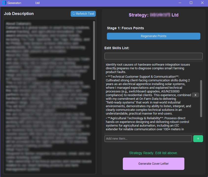 Additionally, this is a good example of Python integration with the web, where we have google docs being used as a cover letter destination, and Gemini being used twice to form the strategy and the final output. As AI becomes more competent, I can change my models to find either better value in terms of API offerings or output quality.